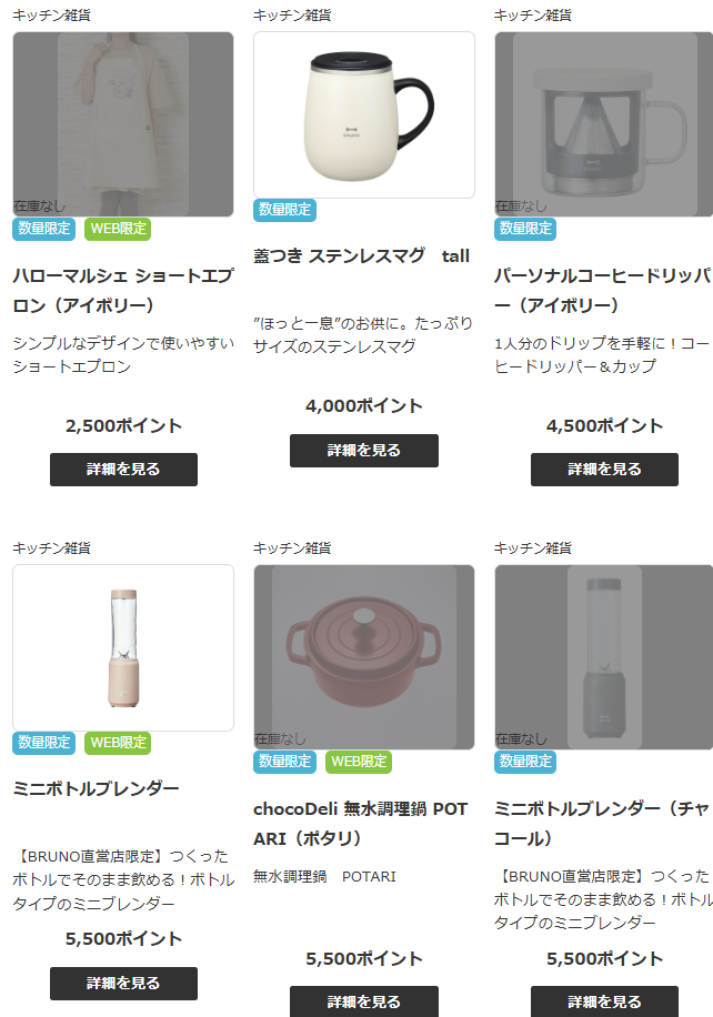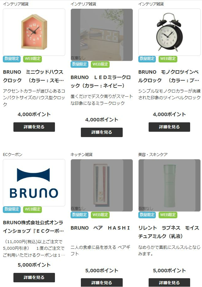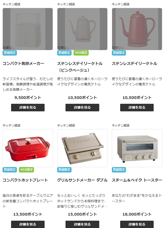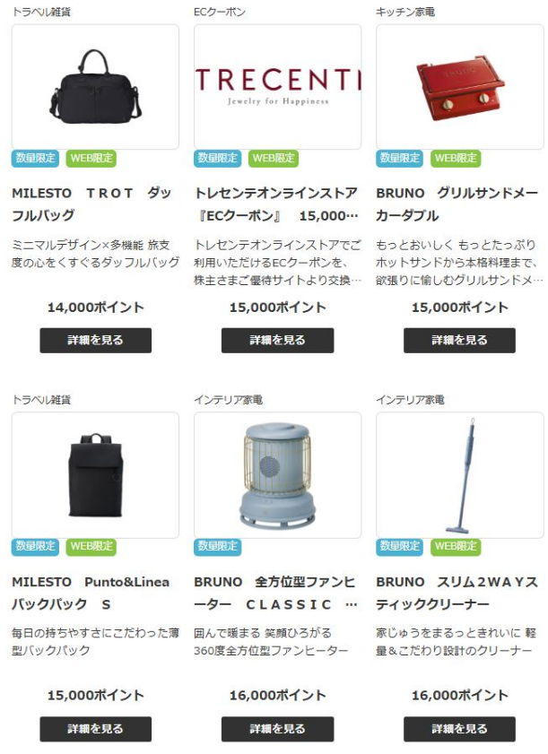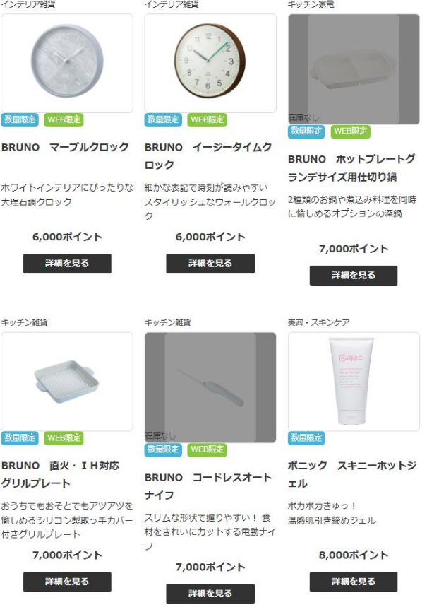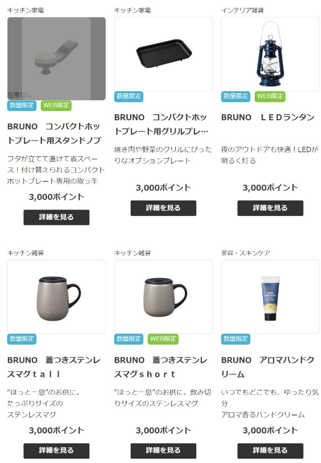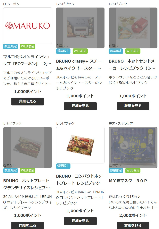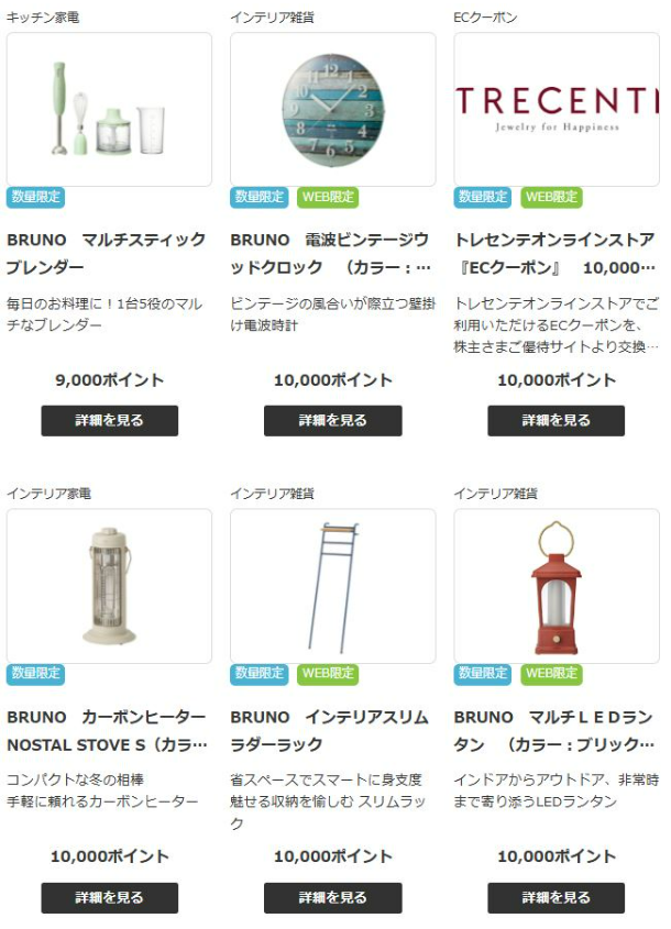 ・ある程度商品幅広いが競争率高くてget困難 ・美容や健康アイテムがほとんどのため欲しい商品ない場合あり ・筆頭株主変更により社名変更、これにより今後優待動向変化の可能性もあり ・BRUNOアイテム充実で実用性高いもの多い