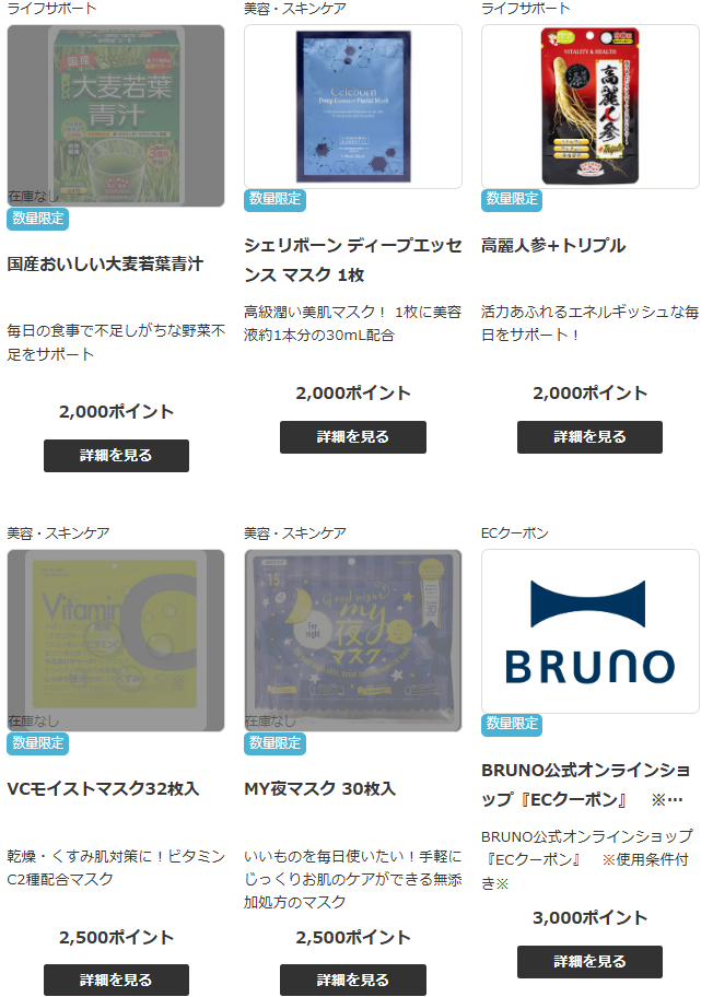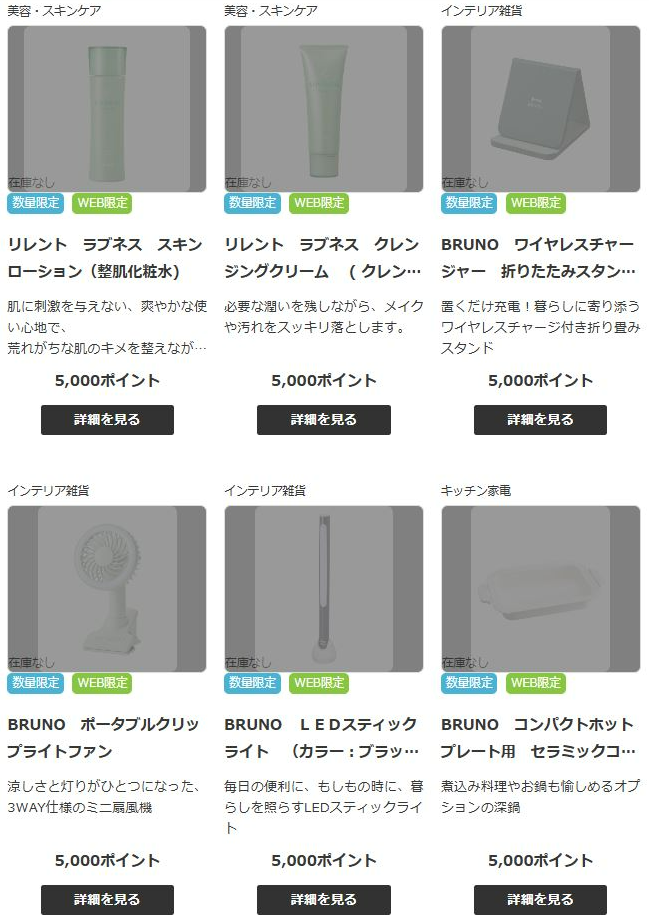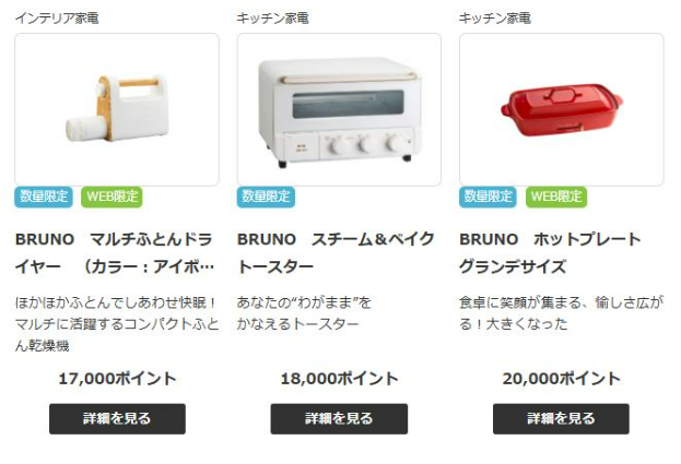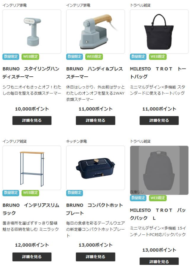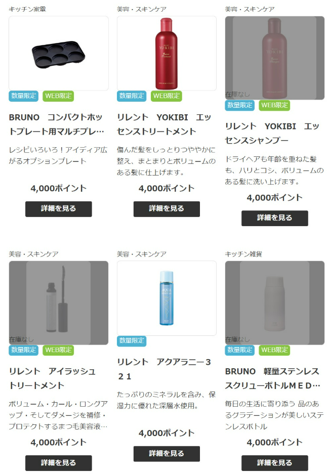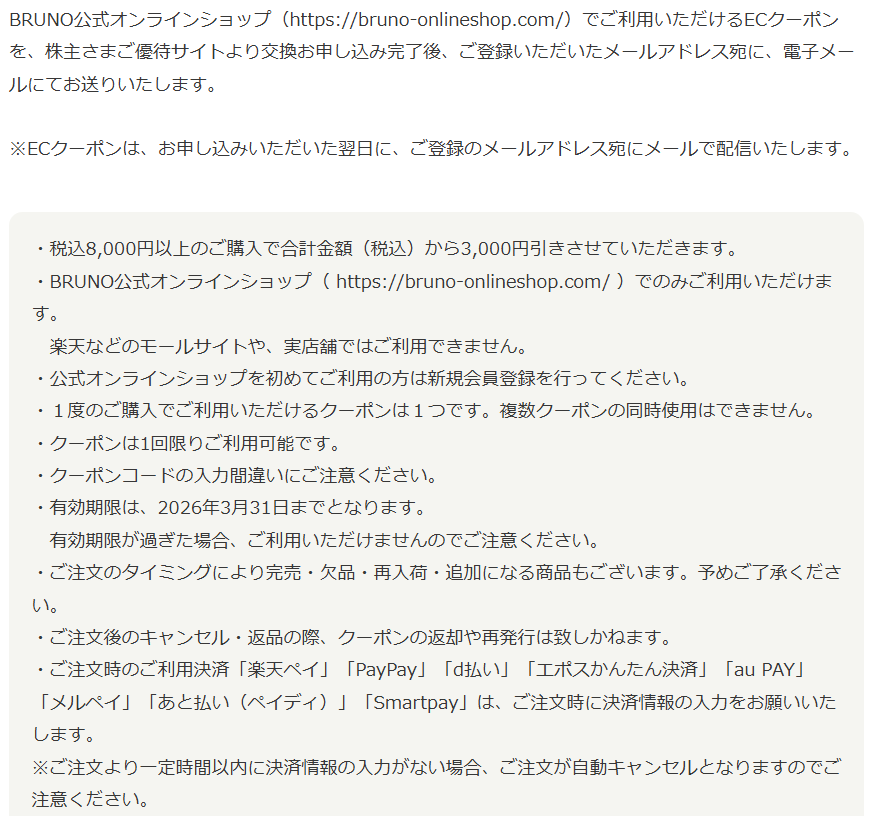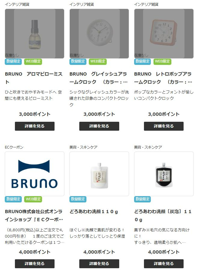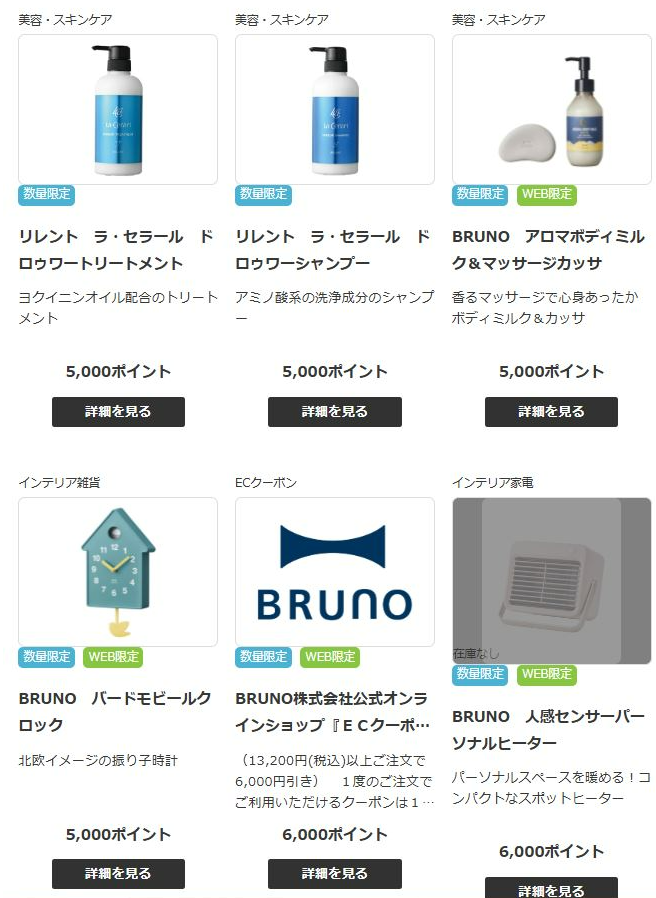 ・ある程度商品幅広いが競争率高くてget困難 ・美容や健康アイテムがほとんどのため欲しい商品ない場合あり ・筆頭株主変更により社名変更、これにより今後優待動向変化の可能性もあり ・BRUNOアイテム充実で実用性高いもの多い
