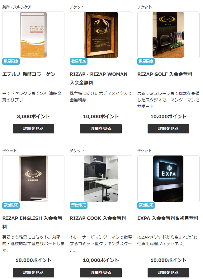 ※RIZAP本体には、入会金無料&コース16回分半額などのチケットもありましたが、20万ポイント必要(16,000株保有+積立必要)なので現実的ではないかなと思います。