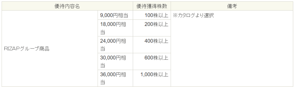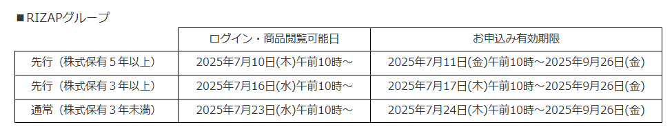 また、RIZAPは株を継続保有することで、その年数によって通常より早く注文可能な先行特典があるので、長期保有に取り組むのも良いかもしれません。
