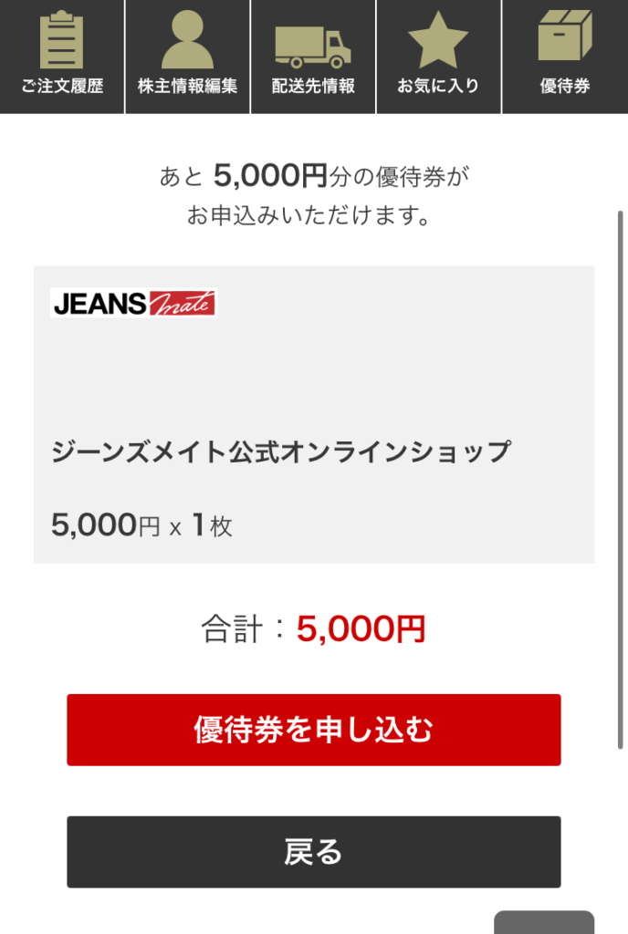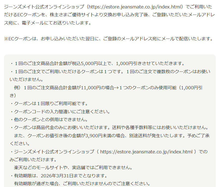 ここで言う各企業とは、優待を提供元の企業以外も入っており、例えばカジュアルファッションを販売するジーンズメイトなどもあります。