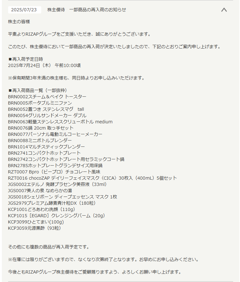 RIZAP本体は株式継続保有年数によって先行注文が可能なため、通常の注文期間に入った時にはすでにめぼしい商品はほとんどなくなっているのでは?と思うかもしれません。