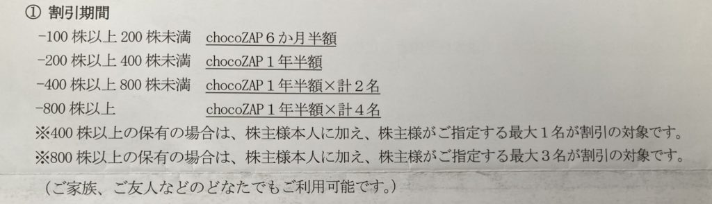 チョコザップの50%割引を受けることが可能です。持ち株数に応じて割引期間・人数が変動します。