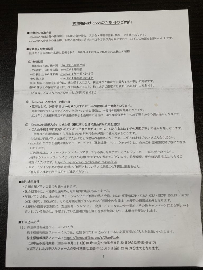 かなりお得でありがたい優待内容にはなりますが、個人的に少し残念な所があり、(2023年度)以前の優待はチョコザップが無料になるものだったのに、今回から半額となってしまいました。その代わり割引期間や対象人数が拡大はされましたが、やはり無料が良かったなぁとは思います。