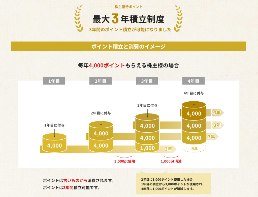 ちなみに、RIZAP本体だと継続して株を持ち続けることで、ポイントを2年まで持ち越して最大3年分のポイントを同時に使うことができます。